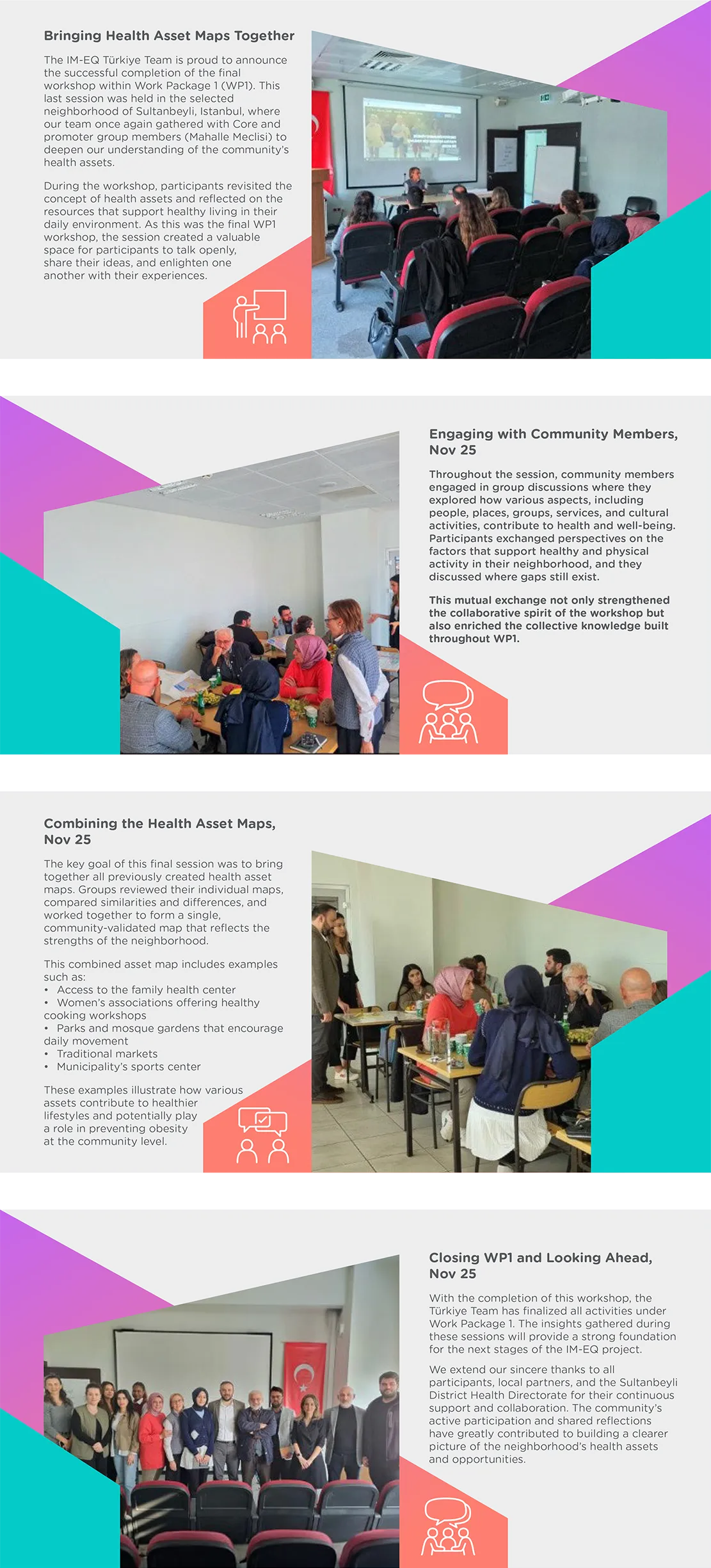 The IM-EQ Türkiye Team has completed all activities under Work Package 1 (WP1) with the final workshop held in the Sultanbeyli district of Istanbul. This closing session consolidated the participatory work carried out with community members and the Mahalle Meclisi, focusing on identifying, discussing, and validating local health assets. By merging individual maps into a single, community-endorsed health asset map, the workshop produced a grounded and collective understanding of neighborhood resources, establishing a concrete foundation for the next phases of the IM-EQ project.